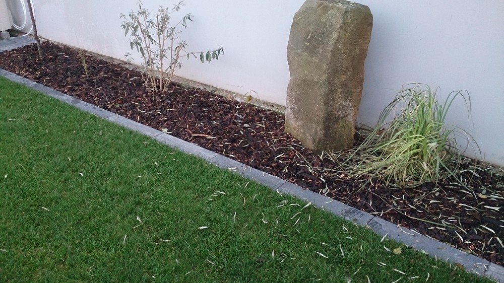 - mit Rollrasen,Pflasterungen, Mähkante, automatische Bewässerung und Mähroboter